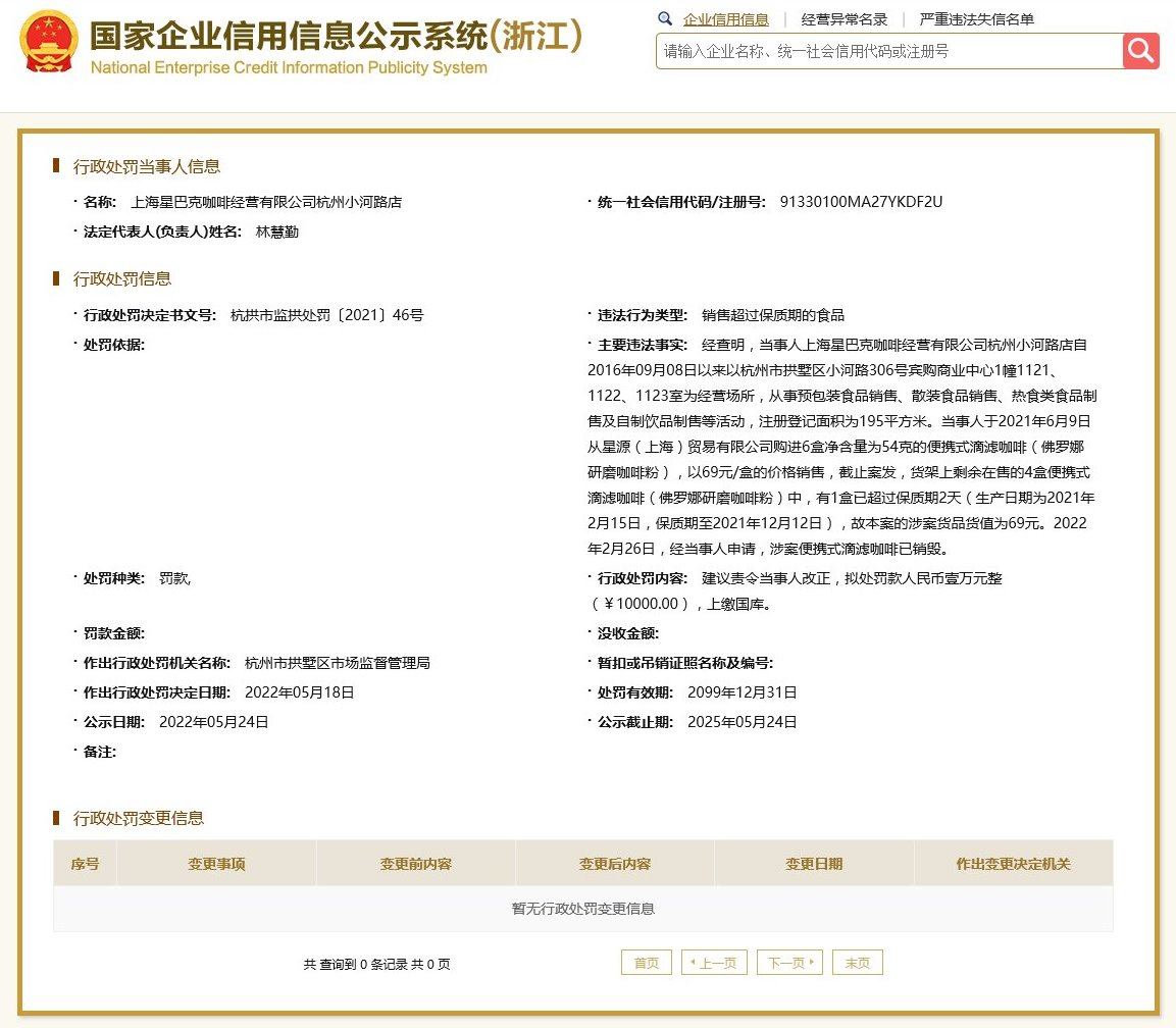 5月24日,国家企业信用信息公示系统(浙江)上新增一则由杭州市拱墅区市场监督管理局作出的对上海星巴克咖啡经营有限公司杭州小河路店的行政处罚决定书,详情如下。